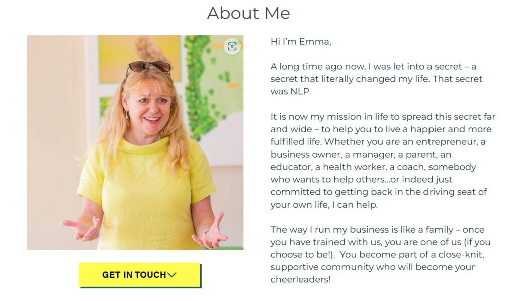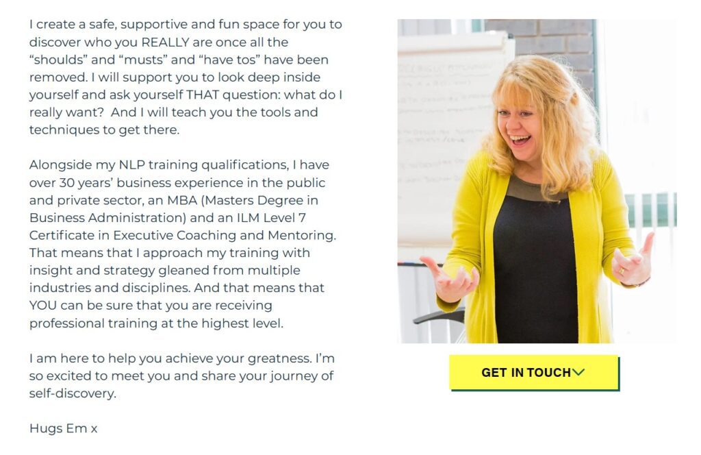 It is now clear from the About Me page what the client can gain from working with Emma – a secret to living their best life, a close-knit community, a safe space to explore what they really want and professional, high-level training.